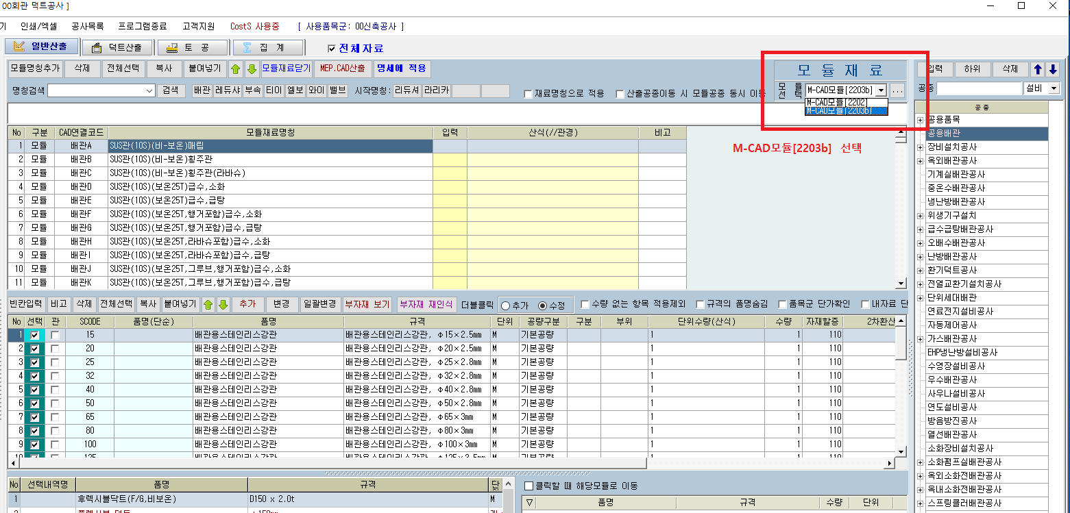 오른쪽 상단의 콤보박스 모듈선택에서 M-CAD모듈[2203b] 를 선택하신 후 다시 작업해 보시기 바랍니다.