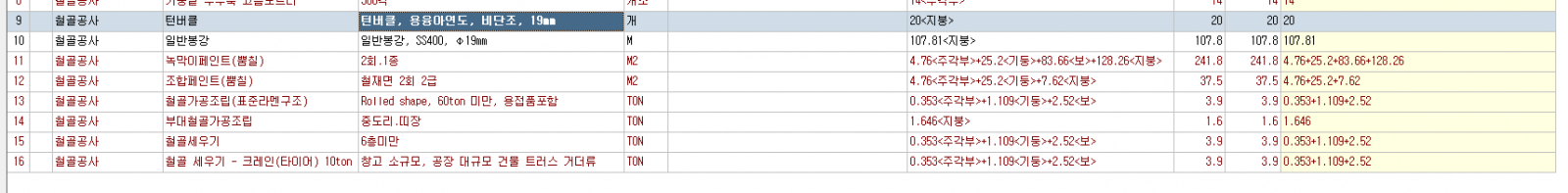 골조내역에서 뽑은 철골을 마감내역으로 전송하였을때 마감에서는 사진첨부처럼 철골세우기' 부대철골가공조립 등 내역이 나오는데