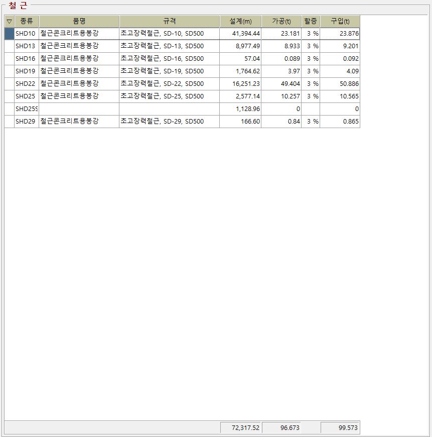 산출된 물량 상세보기 시 내진철근 물량이 안나옵니다.
