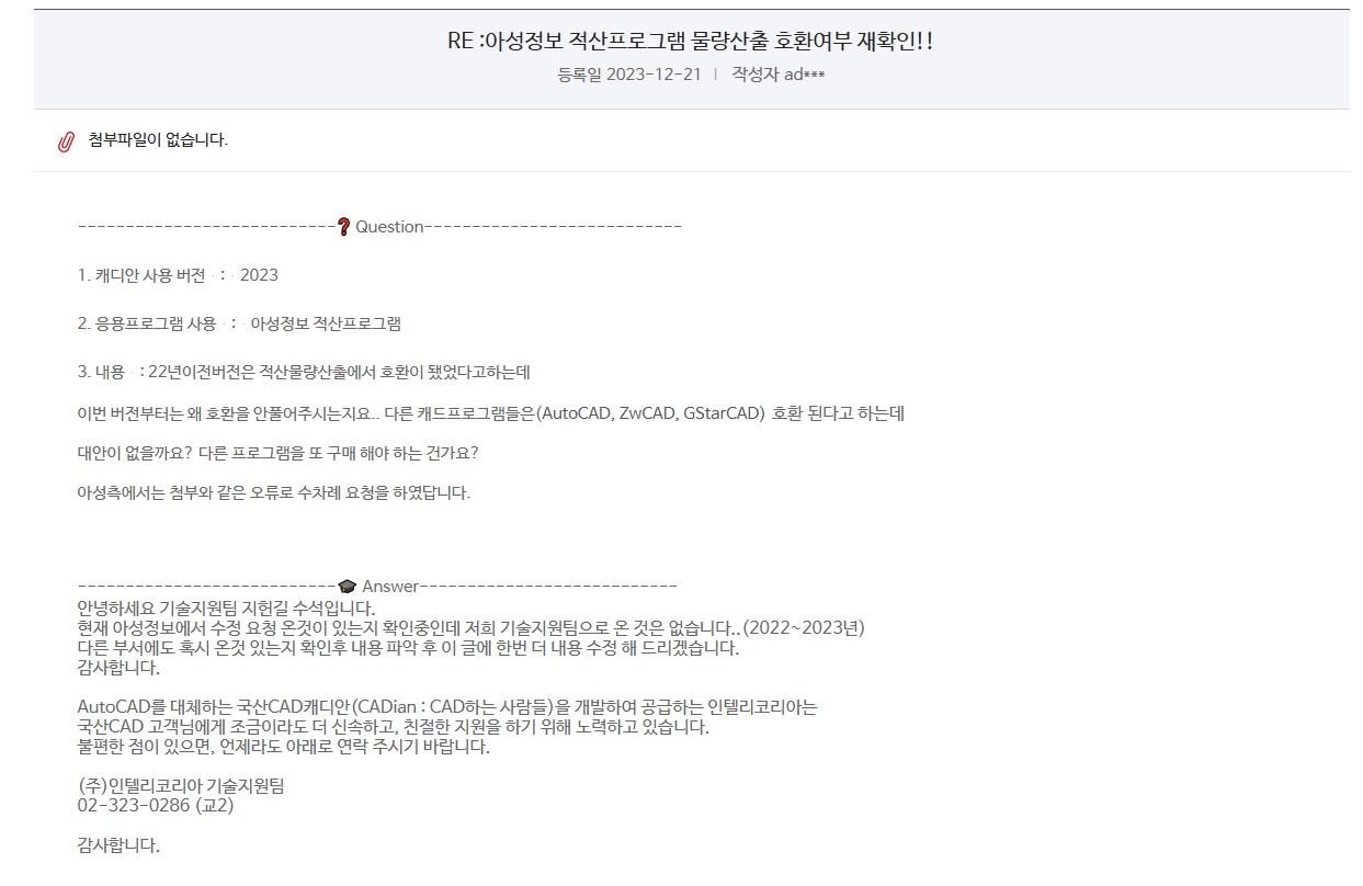 캐디안2023호환관련 캐디안측 답변입니다. 페이지 정보 작성자김상현 댓글0건 조회26,372회 작성일23.12.26 00:00 본문 아~~ 왜 캐디안만 ㅡㅡ 이전글[RE]: 배관 산출관련 문의 23.12.28 다음글[RE]: 캐디안2023호환관련 캐디안측 답변입니다. 23.12.27