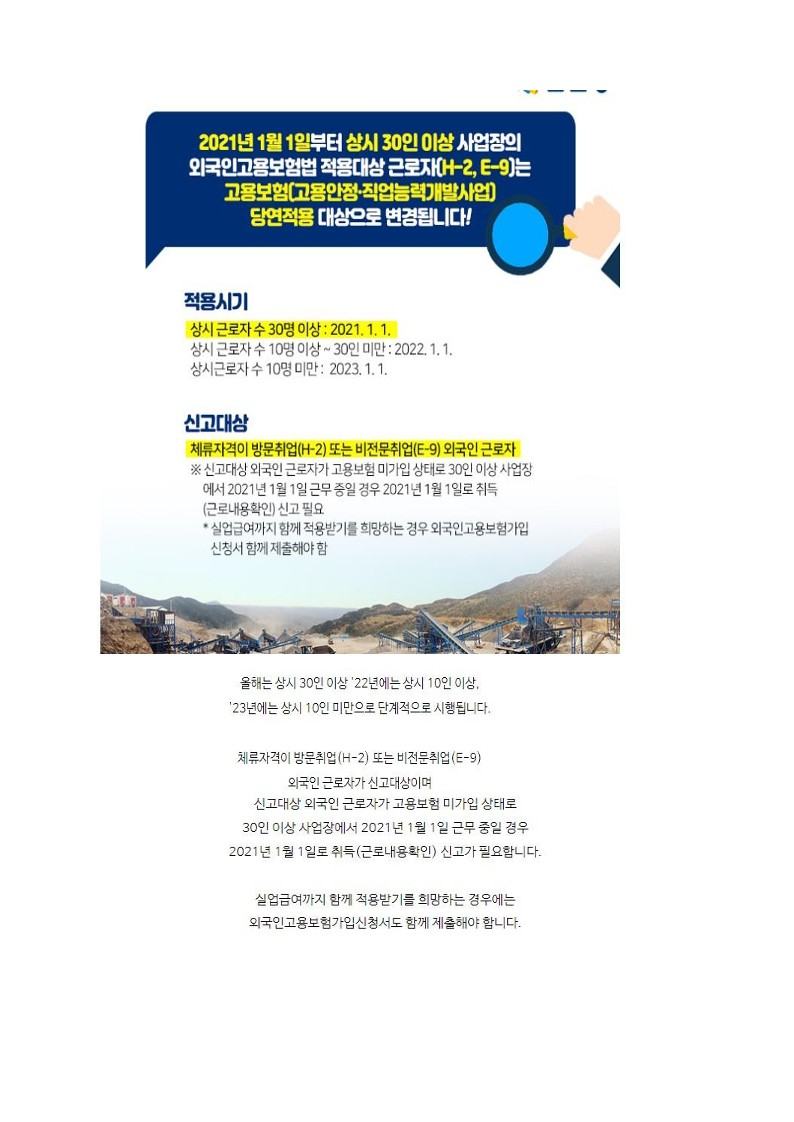 H2' E9 2021년 1월 1일부터 고용허가대상이라는군요... 실업급여부분은 선택사항이고... 요즘 이걸로 건설 노조들이 고용센터에 신고들 하나봐요.... 적용부탁드려요