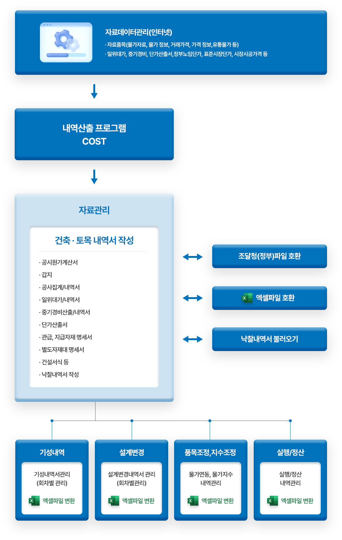 3) 내역서, 일위대가 내역서, 중기경비 산출서, 단가산출서, 조달청 파일 변환 및 불러오기, 원가계산서, 기성내역서, 설계변경 내역서, 물가연동(지수조정, 품목조정)내역서, 준공내역관리, 정산 내역관리등